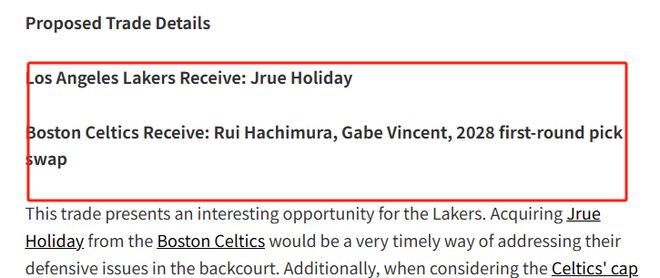 霍乐迪是联盟顶级 “冠军拼图”,过去五年两度随队夺冠,攻防一体属性(场均 11.4 分 + 历史级换防能力)能直接提升湖人竞争力。其3240万美元薪资对凯尔特人构成压力,而湖人通过送出到期合同(八村塁、文森特)和未来选秀权,以较低成本升级后场防守。凯尔特人则通过交易释放薪资空间,为留住塔图姆 + 布朗组合争取操作弹性。